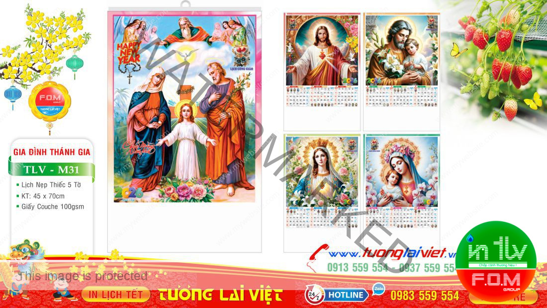 Lịch 5 tờ nẹp thiếc thường được in Offset 1 mặt trên giấy C105gsm, có kích thước: 36×70 và 45x70cm. Lịch 5 tờ Lịch công giáo là mẫu lịch tờ treo tường giá rẻ nên được nhiều cửa hàng nhỏ lẻ chọn in lịch tết năm nay để làm quà tặng cuối năm cho khách hàng, bạn bè, đối tác và người thân nhân dịp năm mới.