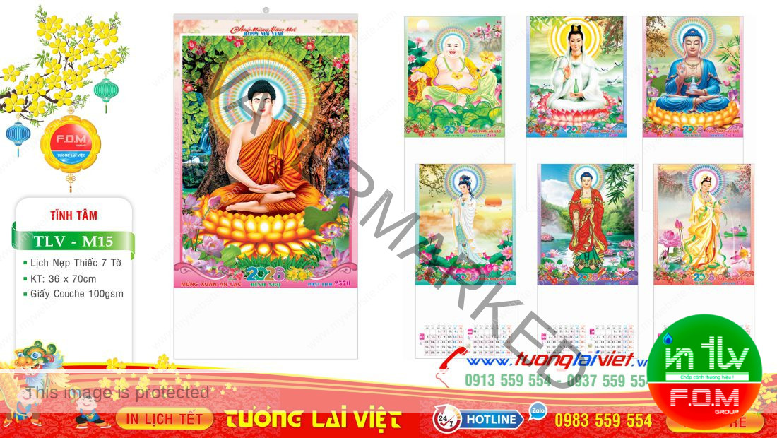 Lịch 7 tờ nẹp thiếc thường được in Offset 1 mặt trên giấy C105gsm, có kích thước: 36×70 và 45x70cm. Lịch 7 tờ Lịch Phật giáo là mẫu lịch tờ treo tường giá rẻ nên được nhiều cửa hàng nhỏ lẻ chọn in lịch tết năm nay để làm quà tặng cuối năm cho khách hàng, bạn bè, đối tác và người thân nhân dịp năm mới.